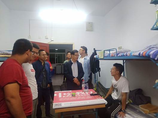 9月5日晚,新生报到一结束,米兰官网党总支书记王建斌、副书记刘正、副院长杨玲娟分别带领新生班主任、辅导员和学生干部深入华英公寓、芝园公寓、行健公寓看望2019新生。