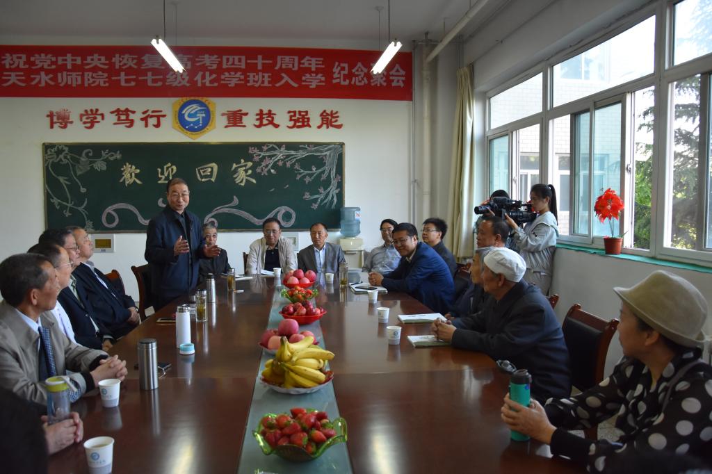 五月的天水师范学院天朗气清、风和日丽,欢声笑语、情深意浓。在这美好的日子里,天水师范学院ac米兰官网中文网站迎来了党中央恢复高考后化学系77级师生的40周年聚会。校友联谊会主任崔宝珍、米兰官网党总支书记王小芳、副院长吕玲玲出席座谈会。
