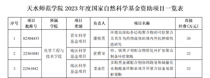 近日,国家自然科学基金委员会发布了《关于2023年度国家自然科学基金集中接收申请项目评审结果的通告》(国科金发计〔2023〕62号),米兰官网共有3个项目获批立项资助,其中青年科学基金项目1项,地区科学基金项目2项,直接经费总计94万元。