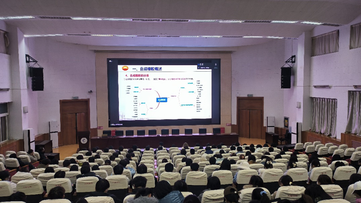 12月17日,学院邀请中国石油兰州化工研究中心合成橡胶研究所所长赵志超博士作了题为“我国通用合成橡胶产品及生产工艺技术”的学术报告。学院教师、2022级、2023级化工、应化专业学生200余人聆听了报告。报告首先介绍了我国通用合成橡胶产品,如丁苯、顺丁等橡胶特性与应用,通过阐述生产工艺,包括原料、聚合反应等技术细节及难点,进而分析产业现状、市场供需与政策,展望技术高性能化、绿色化发展趋势。赵博士着重指出,应化化工专业人才培养,需着眼于国家战略,鼓励毕业生深入企业工厂一线,洞察行业需求。